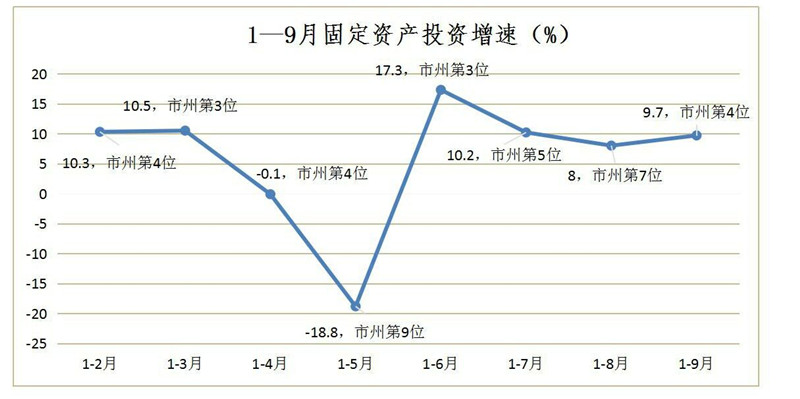 1—9月,全市固定资产投资增长9.7%,较上月提高1.7个百分点,高于全省平均水平0.8个百分点,增速居全省市州第4位,位次较上月提升三位。